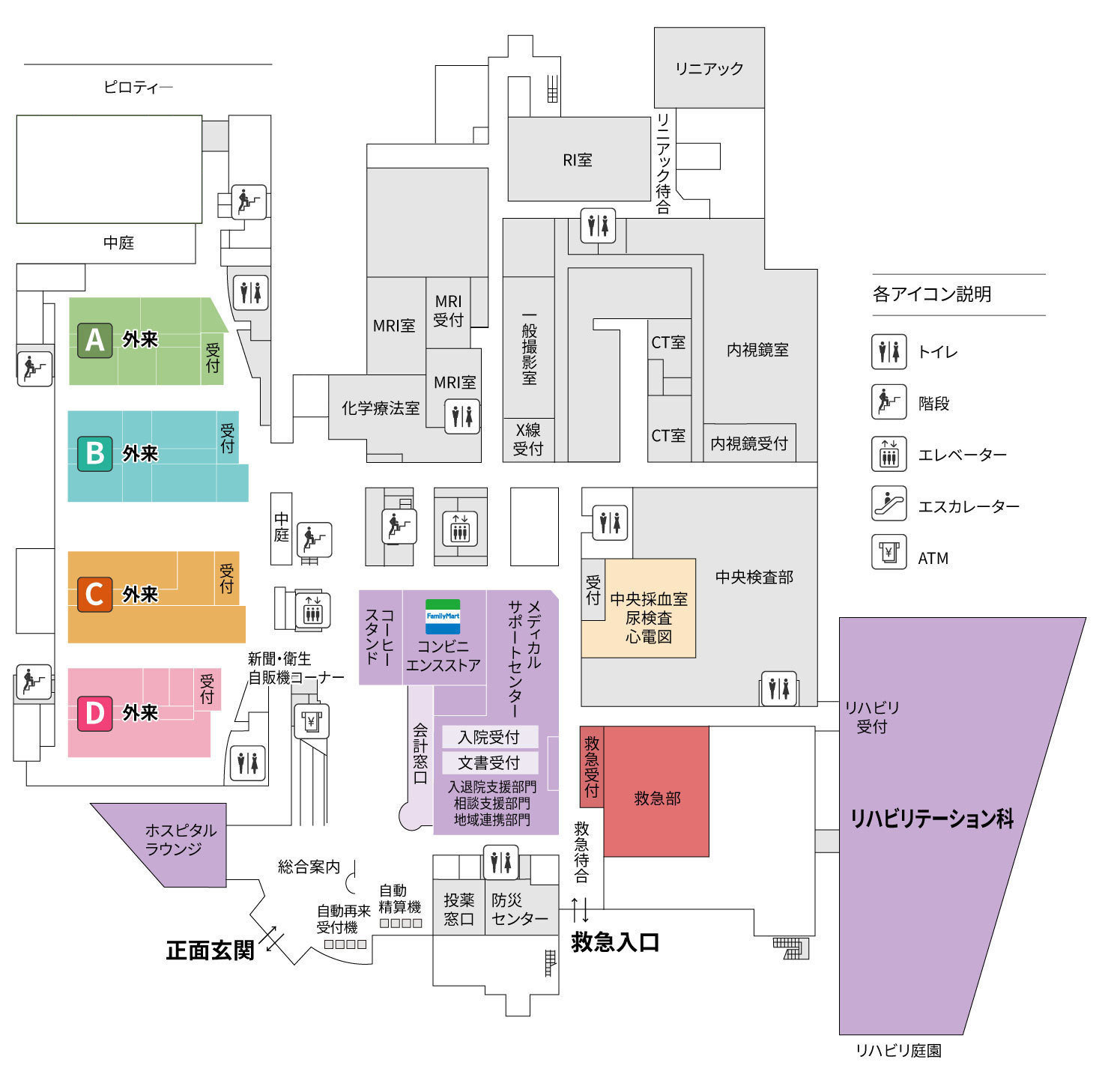 ※正面玄関の開放時間は、平日7:45~17:00です。17:00~7:45まで及び土日祝日は、救急入口からお入りください。