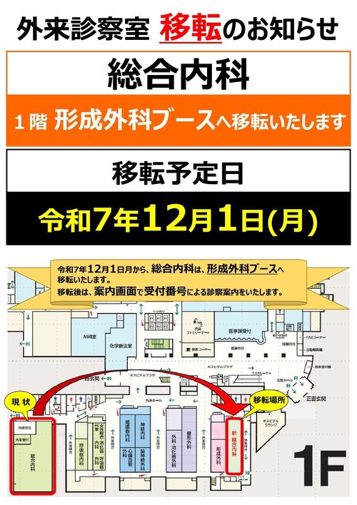 令和7年12月1日(月)より、総合内科が 1階形成外科ブース に移転いたします。