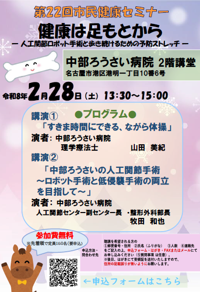『第22回市民健康セミナー「健康は足もとから― 人工関節ロボット手術と、歩き続けるための予防ストレッチ ―』を開催します。